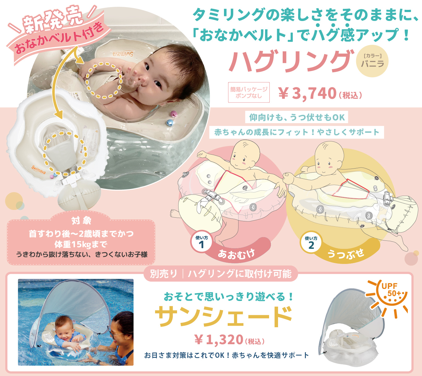 ●おなかベルトがベビーをしっかりサポート ●あおむけ、うつぶせ、両方の姿勢で楽しめる! ●別売りサンシェードを取り付ければ、屋外プール遊びのお日様対策も万全です。