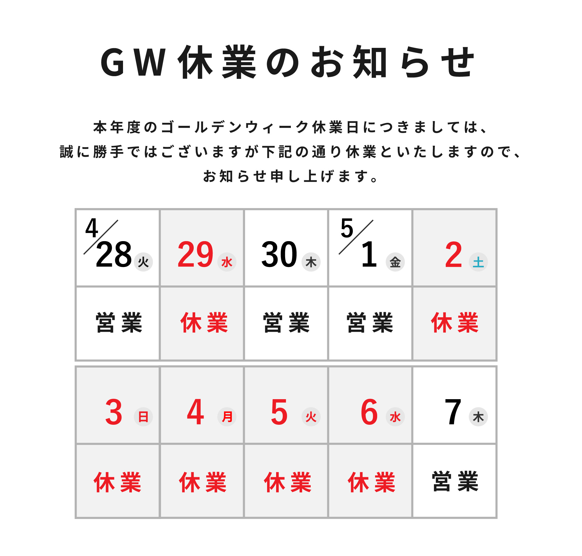 休業中に頂いたお問い合わせへのご返答および交換品の発送については休業日明けの営業日よりご対応を致します。 お客様にはご迷惑をお掛け致しますが、上記の件何卒ご了承頂けますようお願い申し上げます。
