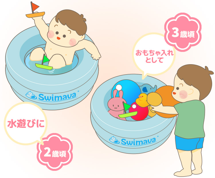 沐浴、お風呂、水遊びにと、0歳〜2歳頃まで長くご使用頂けます。大きくなってからも、おもちゃやおむつ、小物入れとして活用できます。一般的なベビーバスや、お風呂の中での不安定な体勢に比べて、しっかり座ることができてリラックスして入浴できます。